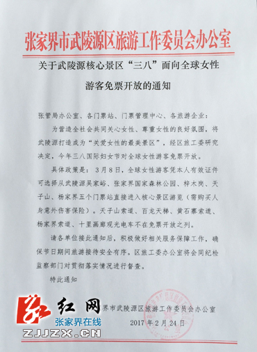 武陵源核心景区“三八节”面向全球女性游客免票开放的通知