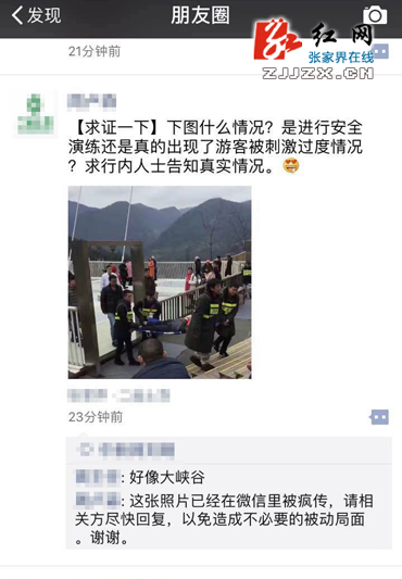 红网张家界分站2月25日讯(记者 李森林)“什么情况?是进行安全演练还是真出现了游客被刺激过度情况?求告知。”、“好像是大峡谷。”2月25日,一则景区内医护人员对客人进行抢救的消息在微信朋友圈传开,有网友表示请相关方尽快回复,以免造成不必要的被动局面。对此,红网时刻新闻记者向张家界大峡谷景区负责人求证,微信朋友圈中传出的消息的确发生在张家界大峡谷景区,游客在游玩玻璃桥项目时自身突发羊癫疯晕倒,微信朋友圈中景区进行安全演练和游客被刺激过度消息不实。