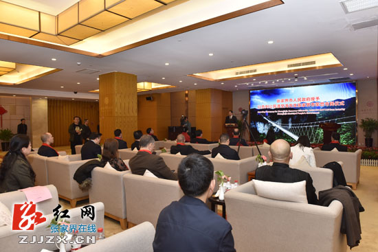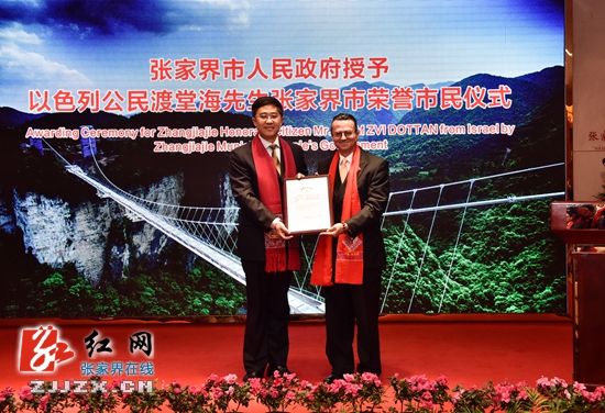 红网张家界分站2月26日讯(记者 全江玲 张潘)2月26日上午11时,张家界大峡谷玻璃桥设计者渡堂海被授予张家界市荣誉市民,以色列驻华大使何泽伟及夫人思佳丽,市领导虢正贵、余怀民、罗智斌、欧阳斌参加仪式。