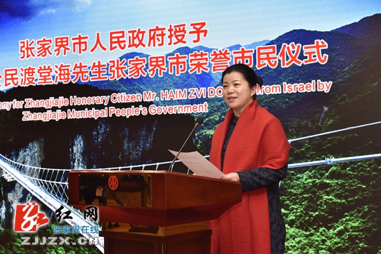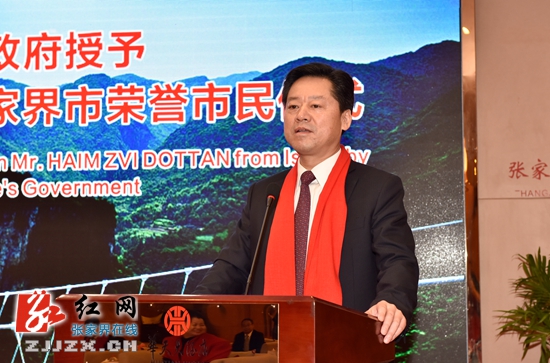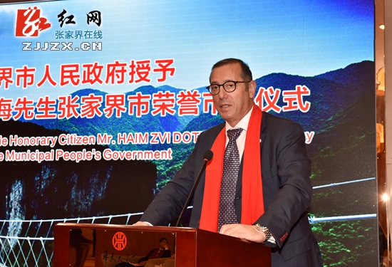 何泽伟在致辞中表示,以色列公民获得张家界荣誉市民的殊荣是高兴和荣幸的,渡堂海先生所做的努力加强了两国民间机构之间的交流合作,促进了中以两国的友谊,也促进了张家界当地的经济发展,这对以色列、中国以及张家界都非常重要。