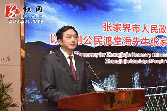 张家界市人大常委会党组书记、副主任余怀民宣读授予渡堂海荣誉市民的决定