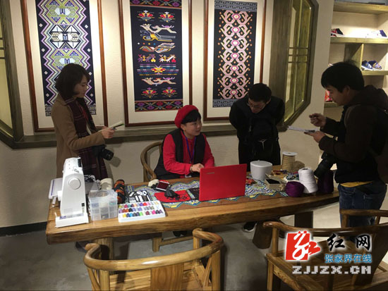 在乖幺妹土家织锦生产基地,媒体团与女工们面对面交流,了解她们的生产生活情况,启动仪式后,张家界市农委主任(市扶贫办党组书记、主任)杨敬初介绍了张家界市脱贫攻坚工作进展情况。