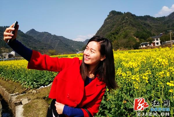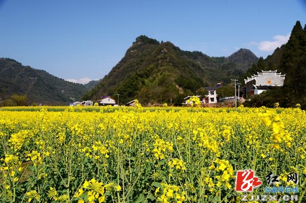 红网张家界分站2月28日讯(通讯员 邓道理)2月28日,一批游客在张家界市武陵源区协合乡杨家坪村欣赏盛开的油菜花海。连日来,随着气候回暖,武陵源区乡村的田野里油菜花竞相绽放,黄灿灿的绚丽了大地,在蓝天白云及土家民居的背景之下,构成了一幅幅富有诗意的田园风光画。