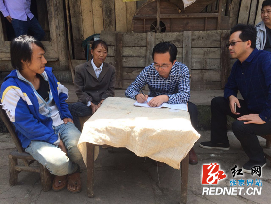 张家界市广播电视台党委书记、台长、总编辑王胜(左三)了解贫困户信息