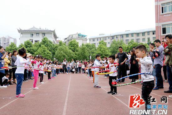 每个孩子每名家长都是运动员。8点38分,伴随着嘹亮的《运动员进行曲》,5个班的幼儿和家长手牵着手,迈着矫健的步伐,脸上洋溢着灿烂的笑容,精神抖擞地经过主席台入场;接着,学校副校长鲁光照致开幕词,教师代表和家长代表讲话;然后进行亲子律动表演,家长和孩子手拉手,心贴心随着音乐一起舞动,亲昵着,依偎着,好一幅舐犊情深图!最后进行“1分钟跳绳”和“30秒呼啦圈”两个个人项目和“亲子抱球接力赛”一个集体项目的竞技比赛。孩子们运动着,欢呼着,家长们奔跑着,呐喊着,把整个活动推向了高潮。