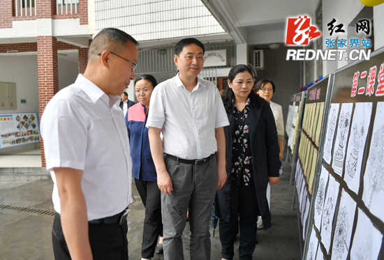 在永定区大庸桥小学,王志刚一行仔细的观看孩子们的作品。