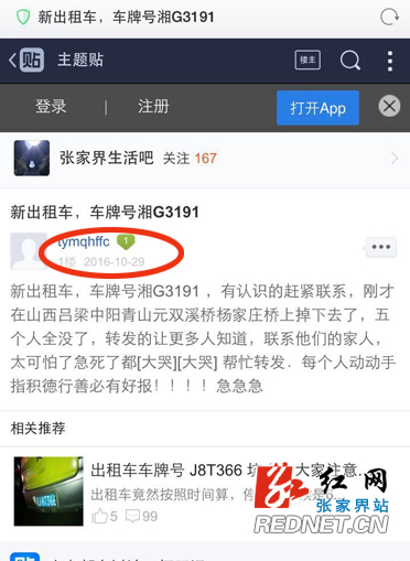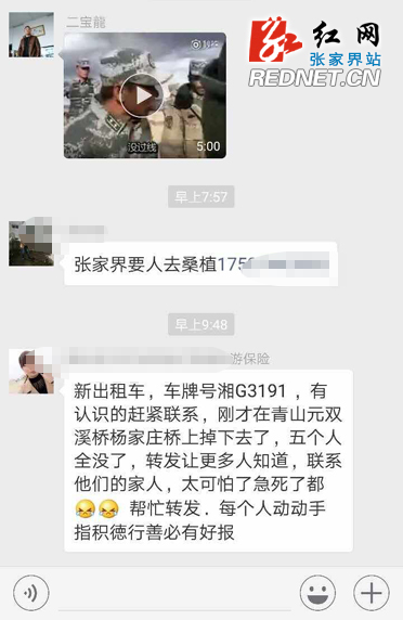 红网张家界分站6月2日讯(记者 张红 通讯员 邓敏)“新出租车,车牌号湘G3191,刚才在青山元双溪桥杨家庄桥上掉下去了,五个人全没了,转发让更多人知道,联系他们的家人,太可怕了急死了都……”6月2日,在不少张家界市民的朋友圈里又被这样一条消息给刷屏了。经过记者与公安、交警、出租车公司等核实,这条消息是假的,别再传了!