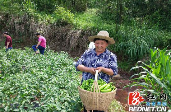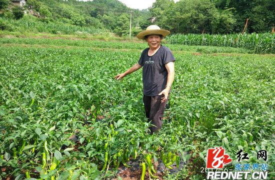 随后一行人冒着炎炎烈日,前往该村二组精准扶贫户——郑任莲种植的辣椒地,看到我们的到来,77岁的郑任莲和她身患有病的女儿抑制不住心中的喜悦,向我们介绍了今年辣椒栽种经过,她说:年前通过村里宣传发动,永安蔬菜种植合作社来技术员到村里给我们培训,国税局给我们提供“三免、一保障”。一是种辣椒劳动力投入不大,适合我们这些体力弱的人;二是产量高,我家栽种1.5亩春提早,从5月中旬开始采摘上市,现已进入盛产期,4——6天采摘一批,每批可采摘1300多斤,现在已经出售辣椒2000多斤,取得收入近3000元。
