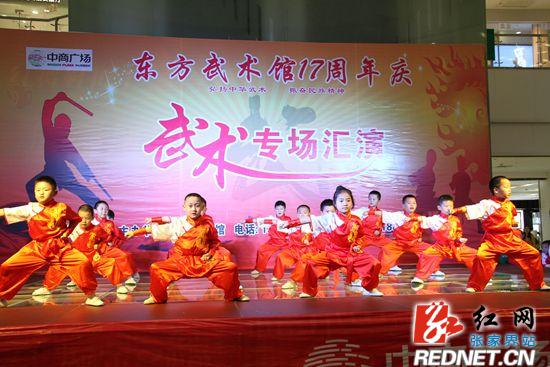 红网张家界分站6月13日讯(通讯员 田贵学)6月11日晚,张家界东方武术馆举办17周年庆武术专场汇演。汇演中, 学员的长拳、太极拳、南拳、散打搏击等精彩的武术表演,给游客和市民带来了一场视觉盛宴。