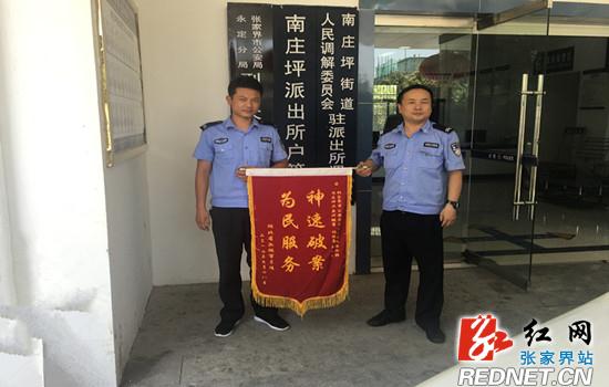 红网张家界分站6月29日讯(通讯员 余欢)6月28日12时许,南庄坪派出所收到一名游客吕某邮寄过来的致谢锦旗,赞扬协辅警胡维勇、胡贻文“为民服务,神速破案”,以感谢他们迅速为自己寻回遗失的手表。