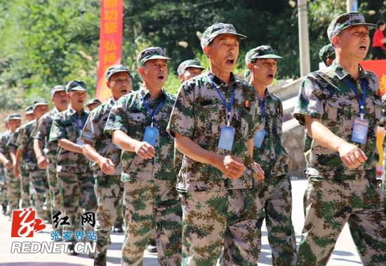 7月18日,在张家界市武陵源区疗养基地(委托张家界孝行天下养老公司为短疗承办单位),参加短期疗养的优抚对象在进行队列训练,重温昔日军旅情。(吴勇兵 摄)