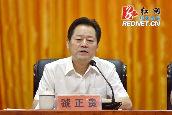 虢正贵要求,全市必须深入学习贯彻习近平总书记系列重要讲话精神,认真贯彻省党代会、省委十一届三次全会和市委七届三次全会精神,切实增强“四个意识”,深入落实《中共湖南省委关于大力实施创新引领开放崛起战略的若干意见》,坚持以改革创新精神统揽今后工作,坚持贯彻一个战略、抓牢五个重点、把握一条主线,确保各项目标任务全面完成、争先创优。贯彻一个战略,就是深入贯彻省委“创新引领开放崛起”战略、落实市委“对标提质旅游强市”战略,着力打造创新要素汇聚的新洼地、着力打造对外开放发展的新高地;抓牢五个重点,就是毫不松懈地抓牢经济工作、纵深推进脱贫攻坚、切实保障和改善民生、坚守生态安全生命线、全力以赴维护稳定,确保经济社会稳定有序;把握一条主线,就是紧紧围绕党的十九大召开这条主线,宣传贯彻党的十九大精神、深入推进“两学一做”学习教育常态化制度化、推动全面从严治党向纵深发展,不断强化政治保障。