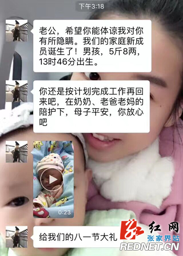 红网张家界分站8月1日讯(记者 王洁 廖秋萍)“老公,希望你能体谅我对你有所隐瞒。我们的家庭新成员诞生了!男孩,5斤8两,13时46分出生。你还是按计划完成工作再回来吧!”昨天,湖南省军区驻张家界市桑植县刘家坪白族乡新阳村帮扶工作队队员兼党支部第一书记曾望振收到妻子发来的信息,有些“傻眼”......