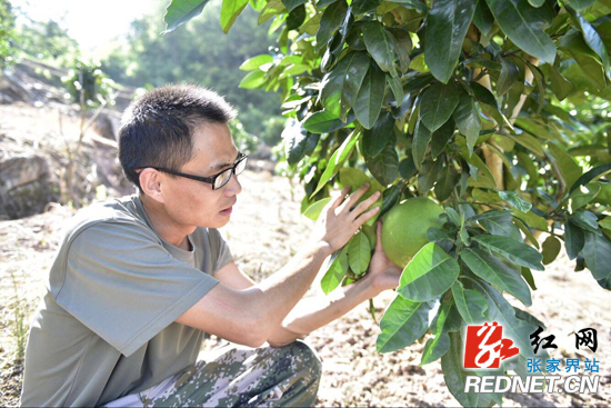 在该村产业扶贫项目——三红蜜柚栽培示范基地,曾望振正在察看由荒地开发而建成的20亩三红蜜柚长势,当看到一个个果实挂在枝头,他不由得露出笑容。