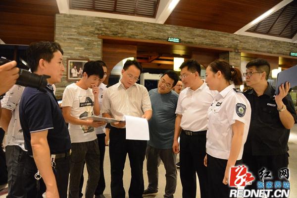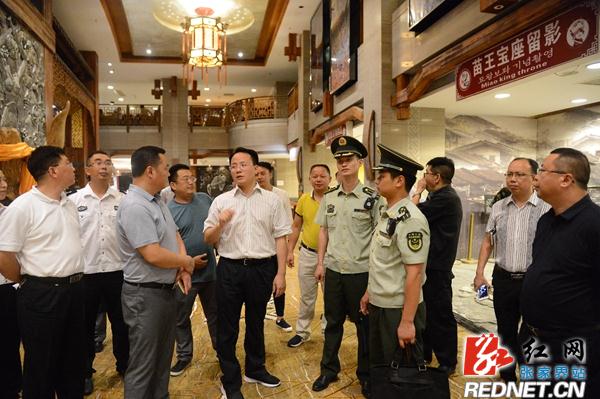 红网张家界分站8月1日讯(通讯员 邓道理 何亮)7月31日晚,武陵源区委副书记、区长郑小胡,在不提前打招呼的情况下,带领区安委办、区公安分局、区消防大队、区文广新局、军地坪街道、索溪峪街道等单位主要负责人对辖区演艺场所安全生产工作进行突击检查和专项督查。区委常委、常务副区长侯铁夫,副区长李湘耀、秦进廷参加督查。