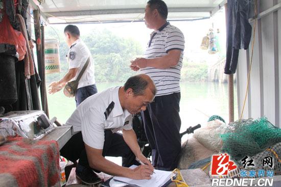 执法人员仔细查看船上的物品