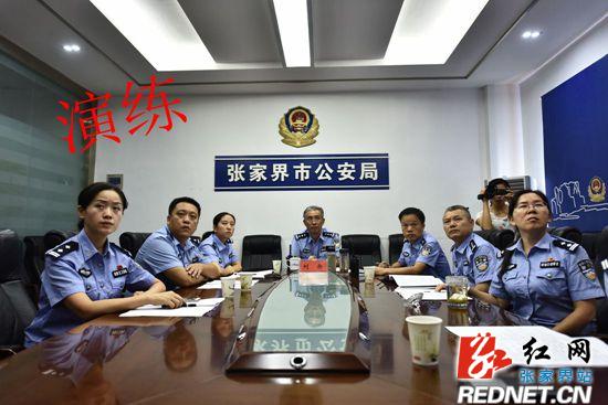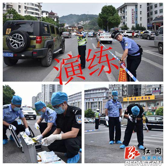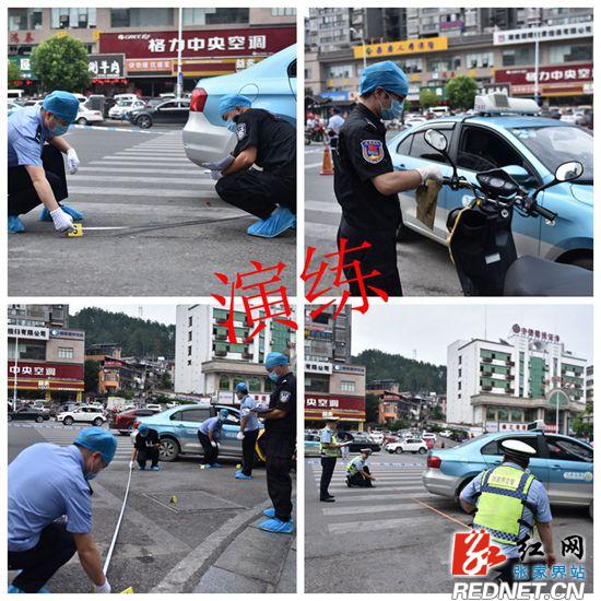 演练模拟9月14日15时35份,张家界市永定城区凤湾大桥西头,一名男子骑乘无牌摩托车与一辆出租车发生交通事故,双方发生冲突,骑乘摩托车男子将出租车司机刺伤后弃车逃跑,伤者被送往医院,经抢救无效死亡。群众见状后拨打110报警。15时39分,市公安局110指挥中心接到报警后,立即指派崇文派出所、交警一大队出警。市公安局立即启动大要案件应急预案机制,迅速成立了由市公安局党委委员、副局长刘余任指挥长,市局和区县局、刑侦、网技、交警、派出所等部门分成现场处置组、追捕缉拿组、封控查缉组、侦查实战中心组同步上案,各部门、警种负责人立即赶赴案发现场,指导、参与侦办工作。