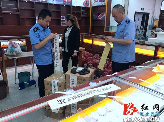 图为执法人员现场查封朱砂产品