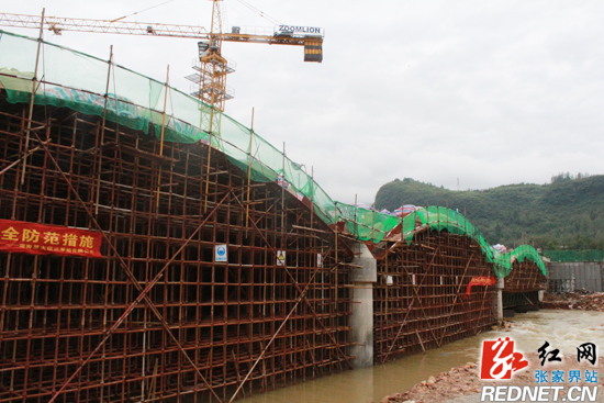 “我们在保证施工安全的基础上,加紧施工抢进度,确保在春节前完成岩门大桥的主体工程,大桥通路,方便市民和游客出行。”在岩门大桥及连接线新建项目施工现场,项目监理肖才林说道。记者在现场看见,岩门大桥主体工程框架已经搭好,工人们正在进行桥梁主拱圈的支架预压工作。据悉,岩门大桥及连接线是索溪峪街道岩门组团进入黄龙洞景区以及常张高速公路的一条主要通道,是武陵源城区的东大门,它的建成能极大的方便岩门组团所有居住人员的出行,对提升武陵源城区东入口形象意义十分重大。