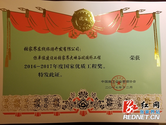 张家界大峡谷玻璃桥工程同时被评为“2016-2017年度国家优质工程奖”。