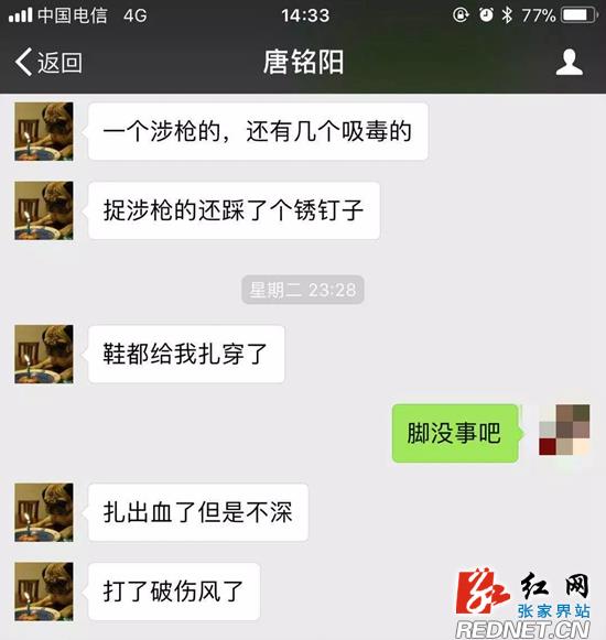在跟随鲁某前往藏枪地点的途中,民警唐铭阳被扔在湿滑地面上的生锈铁钉扎穿鞋底,脚底被扎伤。