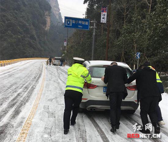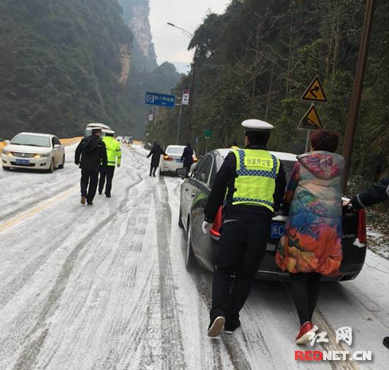 红网时刻张家界1月27日讯(通讯员 胡石友 樊文佳婧)1月26日清晨,大雪来袭,武陵源瞬间白雪皑皑,美不胜收,但同时也对广大市民、游客的出行带来了安全隐患。由于雪大路滑,武陵源各上坡路段成了车辆通行困难区,为了确保辖区重点路段的车辆通行畅安,张家界市交警直属二大队全员上路,提前上岗,并安排民警、协辅警在龙阳公路黄龙洞铁厂至梨子坪隧道路段、插梓线等重点路段设置执勤点,一边指挥交通,一边在风雪中推车,保证道路畅通,他们的行为,感动了广大驾驶员和市民,得到了群众的一致赞扬。