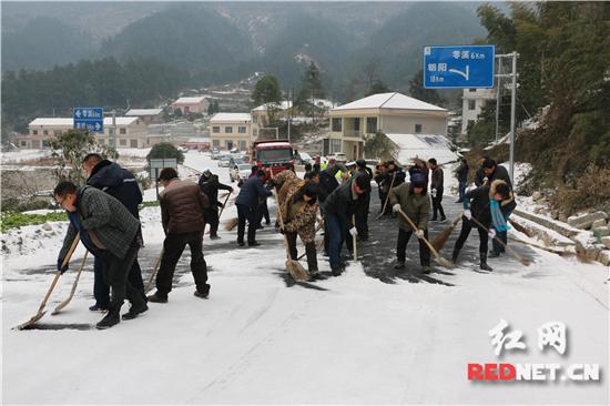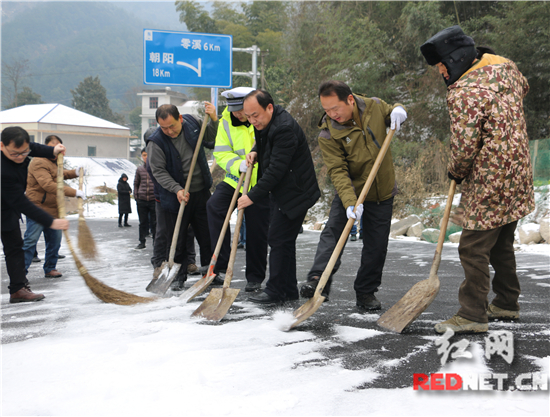 慈利县委副书记舒洪波与基层党员干部群众一起拿起铲子、扫帚在风雪中破冰扫雪排路障
