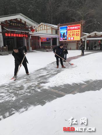 为了让景区道路不再难行,给旅客营造一个良好的出行环境,27日早晨,森林公园门票站各部门齐心协力,他们以雪为令,不畏严寒,热火朝天的开展:破冰除雪保畅通、保安全行动。他们汇集成的除雪队伍,也是这场大雪中最美的身影,在他们的努力下,结冰集雪路面得到改善,极大方便了旅客出行。