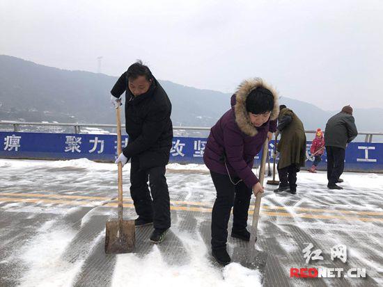 杨柳铺乡党委书记卓亚洲和志愿者在一起清扫杨溪澧水大桥积雪