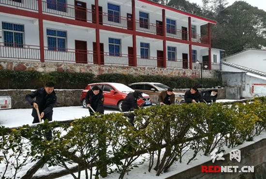 街道干部铲除机关院落内积雪