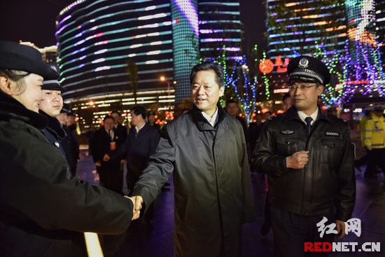 从市民广场出发,沿解放路、迎宾路、人民广场一路行进,处处是缤纷的花灯、彩灯,各种灯组在周围灯楼、灯树的映衬下发出不同颜色的光芒,绚丽多姿的灯光倒影在澧水中,交相辉映。虽然天气寒冷,空中还不时飘着细雨,灯会现场还是挤满了赶来赏灯的人,他们在工作人员的引导下有序流动。虢正贵走入人群中,与沿途值守的工作人员亲切握手,感谢他们的节日期间坚守岗位守护城市的安全。