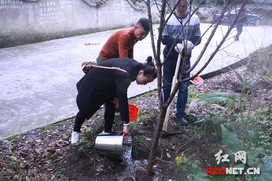 正在给新栽植的树苗浇水