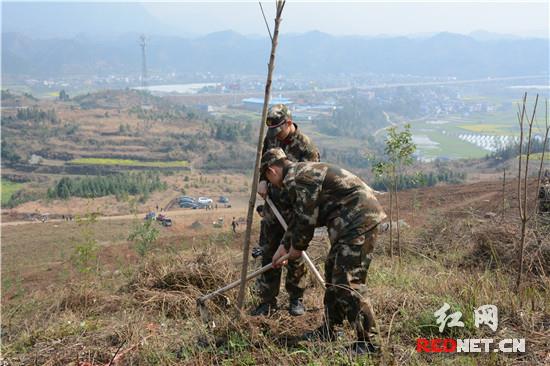 在大庸桥办事处金山村,大家挥锹把锄,分工明确,有的扶着树苗、有的刨坑培土、有的浇水施肥,细心种下一棵棵树苗,为初春的大地增添了丝丝绿意。据了解此次植树造林活动共种植三红蜜柚、黄桃、大叶女贞、柏木等树苗约2500株,面积40亩。