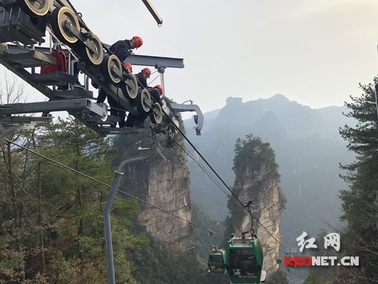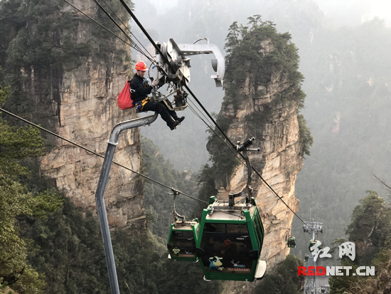 参加垂直救援的救援人员沿着索道小心地滑向被困人员所在的吊箱,用救生缓降器将被困人员缓缓降下至支架下方救护平台。垂直救援与水平救援同时展开整个救援全过程历时1个小时。