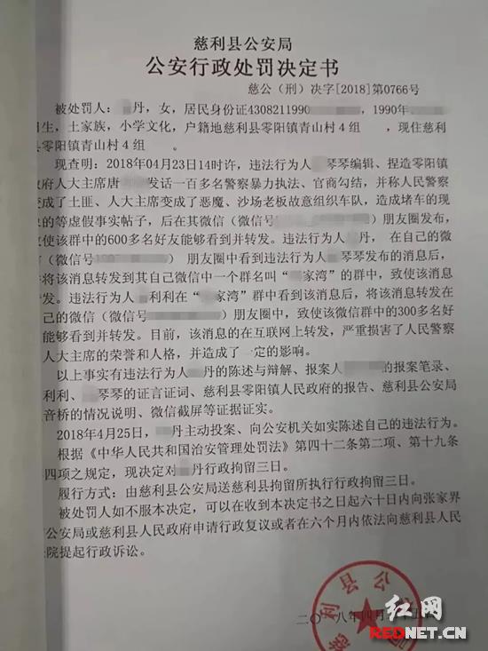 4月25日,慈利县公安局依法行政拘留“琴琴”等三名违法行为人。