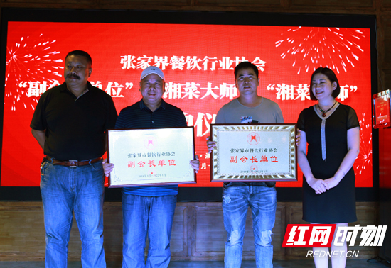 张家界湘府国际餐饮连锁管理有限公司(湘府鱼庄)与张家界长俊厨具有限公司还被授牌“副会长单位”(摄影 廖兆文)