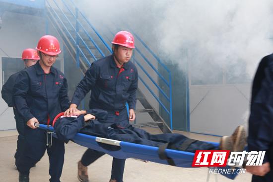 应急救援小组进场用担架救出伤员