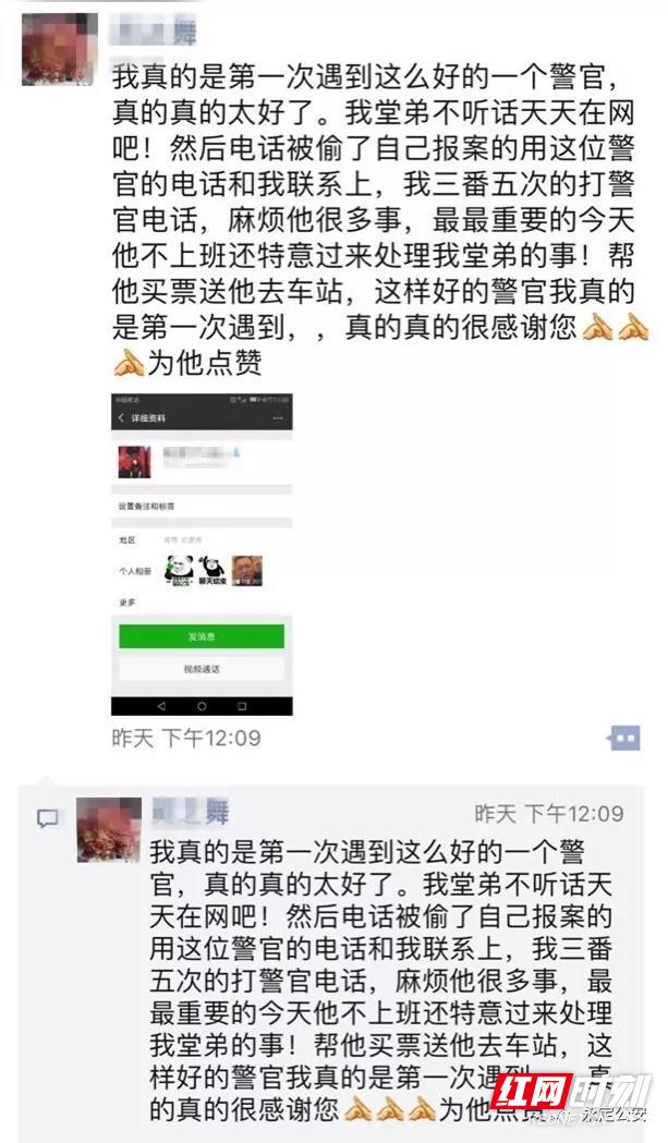 9月9日,崇文派出所接到一名外地小伙的报警称,自己手机被偷了。接到报警后,派出所民警、辅警迅速展开调查,由于小伙无法确定其手机具体被盗位置,且被盗周边无监控可查,便只能根据立案待查。小伙手机被盗,身上没有现金,无法用手机联系其家人,辅警杜金朋便用自己的手机借给小伙打电话。在和家人取得联系后,辅警杜金朋与其家人沟通确认通过转账的方式来支援小伙。直至次日,辅警杜金朋用家人转来的钱帮助小伙购买回家的车票,并送至车站。这本是公安民警、辅警的本职工作,却让这位年轻小伙的家属感动不已,这种感动源于公安民警忠诚担当,履职尽责的务实奉献精神,源于崇文派出所民警、辅警不忘初心,情系群众的为民服务情怀。