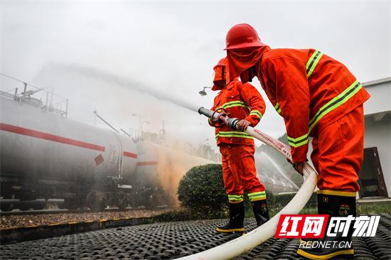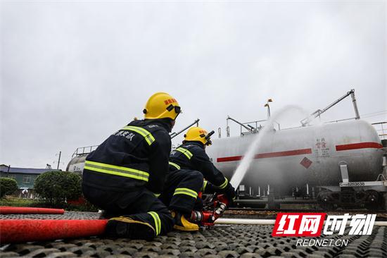 张家界市消防支队接到报警后,迅速调集力量,全勤指挥部遂行出动,指挥作战。各方力量迅速集结,到达现场后,立即投入到灭火战斗中。消防支队迅速成立火场指挥部,根据火情侦察和油库有关人员介绍,部署作战力量。消防官兵根据灭火救援方案,迅速展开火情侦察、安全警戒、冷却抑爆、灭火进攻、火场供水等战斗程序,攻坚组迅速架设水炮阵地,指挥员同时下达命令官兵用泡沫管枪对地面流淌火进行覆盖,供水小组利用消防车向高喷车和移动水炮供水,确保供水不间断。整个演练环节层层推进,衔接紧密,经过40分钟的全力扑救,“大火”被成功扑灭,演练圆满结束。经过安监、环保对空气、水质检测,无污染区域,泄漏区域各项指数达标,没有造成二次危害。