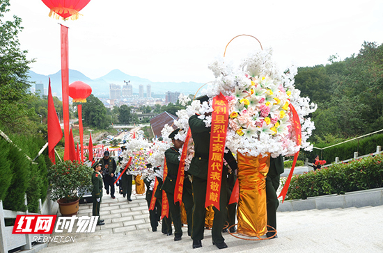 在《献花曲》激昂深情的旋律中,10名礼兵手抬花篮缓步前进,将花篮一字排列放在纪念碑前。全体参加纪念活动的人员依次向烈士纪念碑敬献鲜花,在烈士墓前瞻仰烈士英灵。