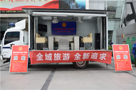 此次国庆期间在天门山索道下站广场、老道湾等重点景区景点定点设立旅游速裁审判联络点,由旅游速裁法庭法官在景区景点巡回值班,并公布“在途速裁”APP二维码,赠送“在途速裁”APP明信片,以宣传推广“在途速裁”APP软件平台,为中外游客提供法律咨询和服务,游客一旦发生旅游纠纷,可以通过注册的APP软件,“在点”进行投诉立案。游客使用手机通过“在途速裁”APP进行投诉后,法庭工作人员即可于第一时间通过后台进入案件程序,利用“在途速裁”APP软件网上受理纠纷案件,速裁法官使用巡回办案车或者便携式法庭装备,随时随地开展庭审、宣传、咨询,也可在APP软件上完成网上开庭、调解,切实做到把法庭开设到景区,到游客身边,在不影响游客行程情况下,切实以最高效的执法和最温馨的服务保障每一位游客在张家界的旅游体验。