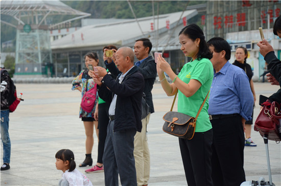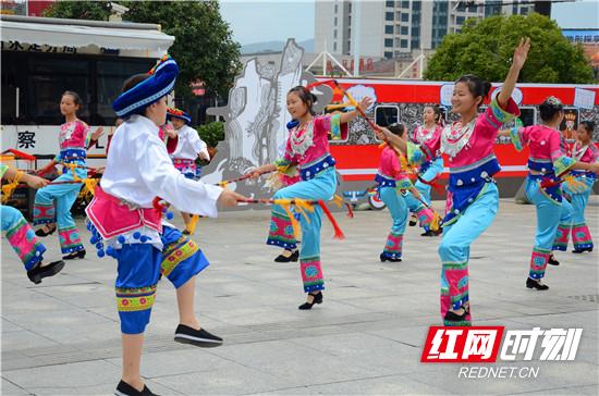 国庆节一大早,他们穿着艳丽的土家族、苗族服装来到火车站广场和天门索道下站,列好队后,伴随着音乐的响起,《幸福苏木绰·九子鞭》、《土家摆手舞》、《土家啦啦操》一个个形态各异、精彩美妙的民族特色舞蹈节目轮番上演,姑娘、小伙们踩着欢快的舞步,表达对祖国的深情祝福。