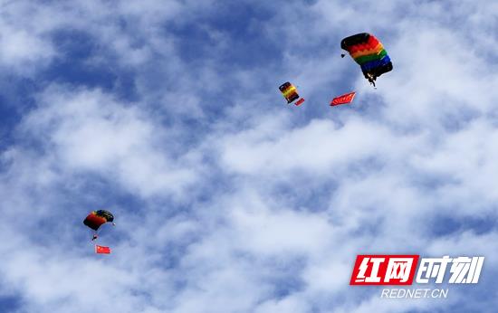 红网时刻张家界10月3日讯(通讯员 毛建初)10月1日下午4点40分,黄龙洞景区万人瞩目,景区上空3名跳伞美女从500米高空变换各种造型,娴熟动作赢得一片叫好声。3分钟后,三名美女在跳伞皇后石春艳的引领下精准的落在哈利路亚音乐厅屋顶。