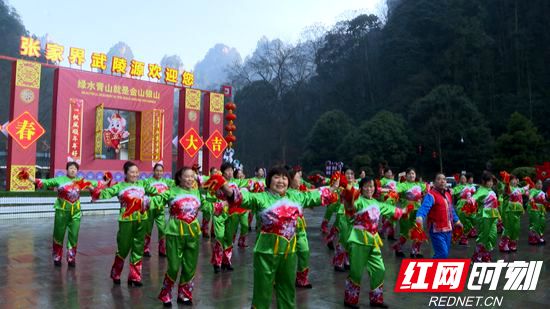 在景区森林公园门票站广场,处处洋溢着欢乐祥和的节日气氛,红红灯笼为广大游人送来新春吉祥。锣鼓塔街道居民自发组织的别具风味的土家民俗表演腰鼓花灯、以及广场舞表演等让游客零距离体验到了张家界独特的年俗文化和不一样的“年味儿。