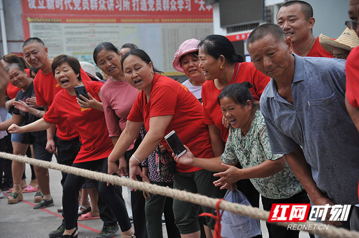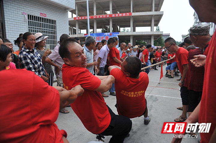 在拔河比赛中,当地村民分片区组织拔河队,队员们身着统一的红色服装咬紧牙关、竭尽全力地拼搏。