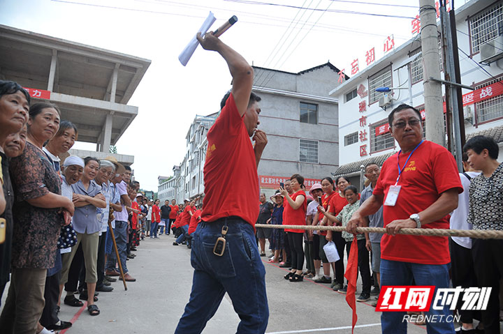 在瑞市居委会,裁判发出拔河比赛开始口令。