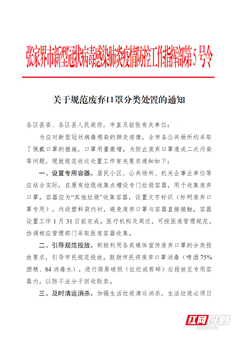 张家界市新型冠状病毒感染肺炎疫情防控工作指挥部第5号令