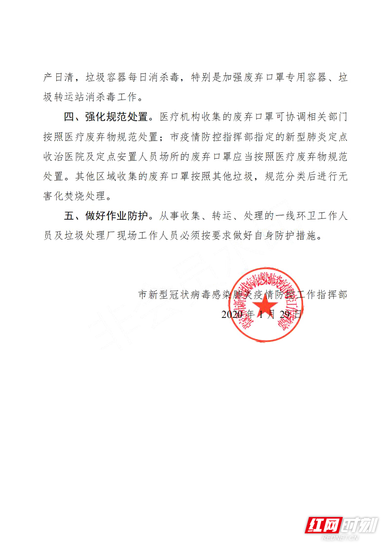 四、强化规范处置。医疗机构收集的废弃口罩可协调相关部门按照医疗废弃物规范处置;市疫情防控指挥部指定的新型肺炎定点收治医院及定点安置人员场所的废弃口罩应当按照医疗废弃物规范处置。其他区域收集的废弃口罩按照其他垃圾,规范分类后进行无害化焚烧处理。
