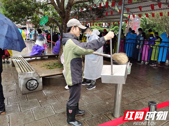 “十一”假期增大的客流量和雨水的天气给保洁工作加大了难度,他们拿着各式工具在人海中穿梭,不断捡拾起游客遗落散落的垃圾,各点的垃圾桶很快“爆满”后,他们于是又需要一次次将垃圾进行清倒垃圾桶,然后送至垃圾清运车上运到垃圾处理中心。由于游人众多垃圾产生增多,垃圾清运车从早晨到傍晚未曾停歇的运转,一天装车清运垃圾十几趟。