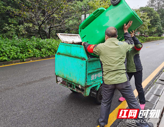 保洁队工作人员正在装车清运产生的一桶桶垃圾。